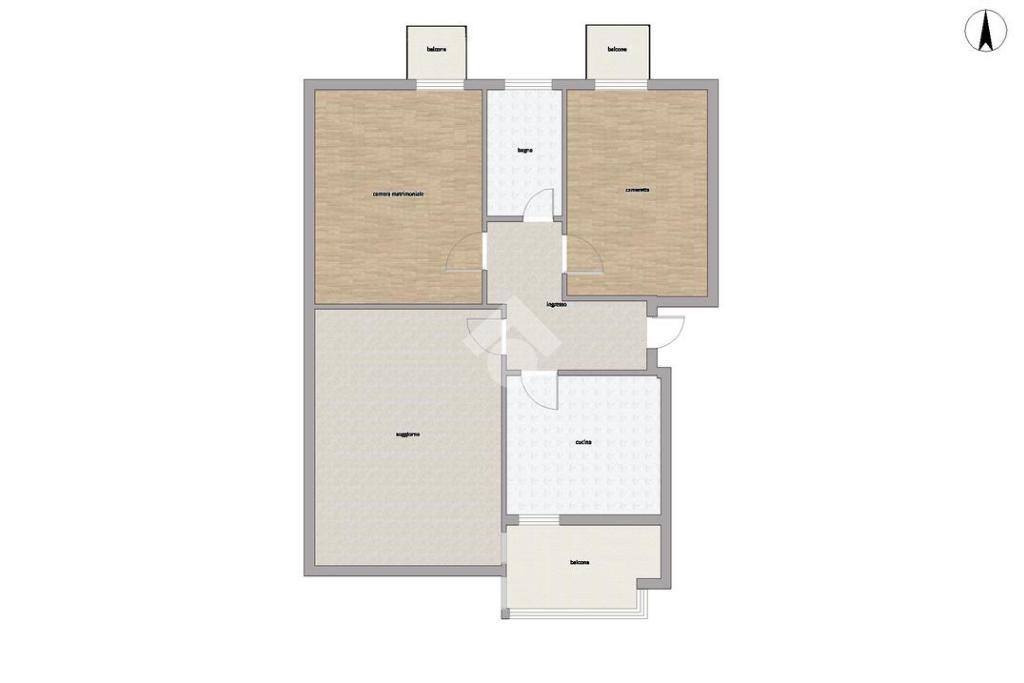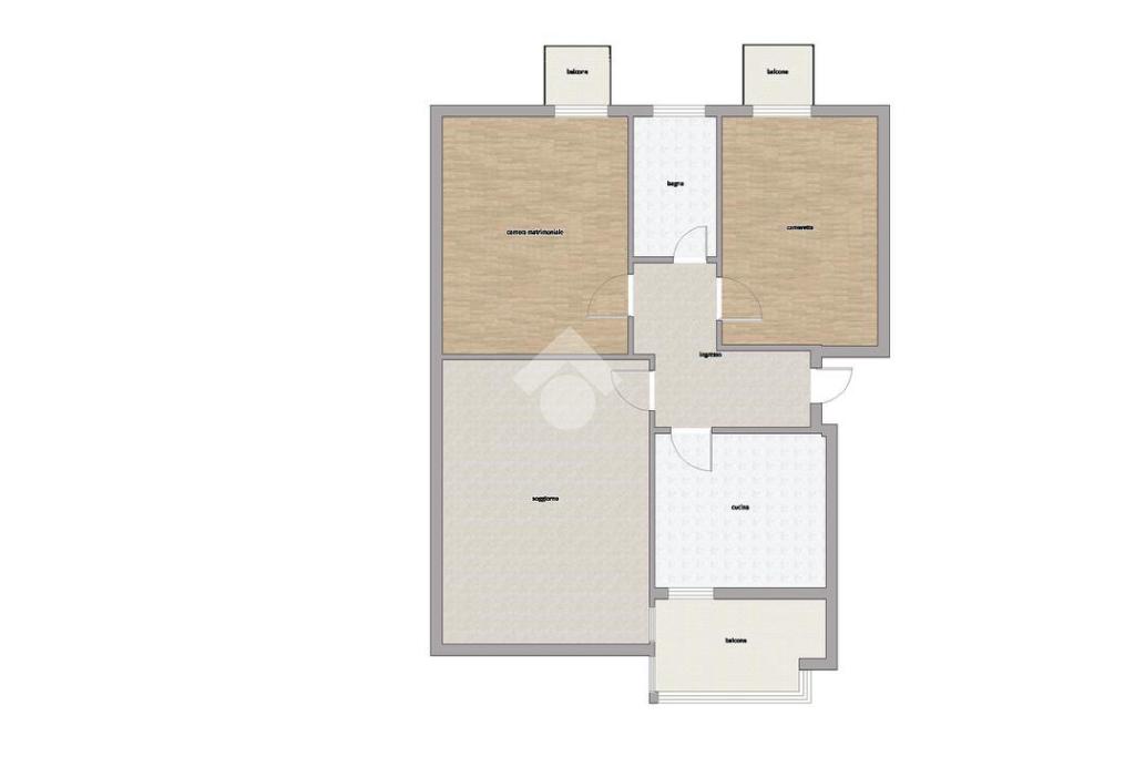 L'ingresso si apre su un disimpegno che conduce alla zona giorno, composta da una cucina abitabile con balcone vivibile ed un soggiorno. Le due stanze sono separate ma servite da un balcone comunicante.
